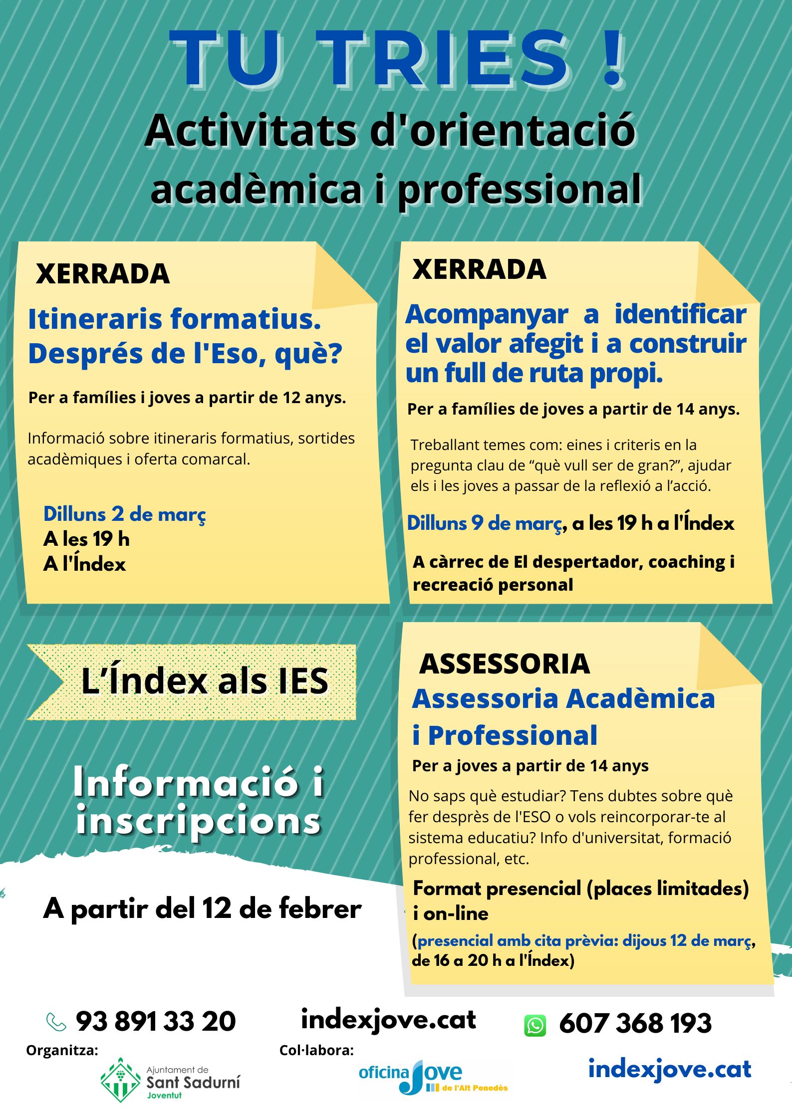 La Regidoria de Joventut ha organitzat de gener a març un conjunt d'activitats adreçades a joves d'entre 12 i 25 anys i a les seves families, dedicades a la orientació acadèmica i professional per afavorir i acompanyar en el procés de decisió en la tria dels seus estudis i itineraris formatius.